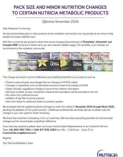 Nutricia announced modifications to several of their medical food products for individuals with MSUD, Organic Acidemias, and PKU. Changes are expected to take place starting November 2024 into early 2025, as the current product supply depletes.